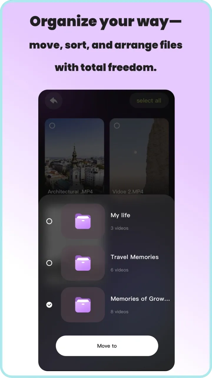 This is your dedicated command center for mobile videos. Centered around your personal footage, it connects everyday clips, downloaded movies, and custom-created folders. With one tap for smooth playback, precise organization, or bulk sorting, it turns every moment captured on your phone into timeless HD memories that can be treasured and revisited anytime.